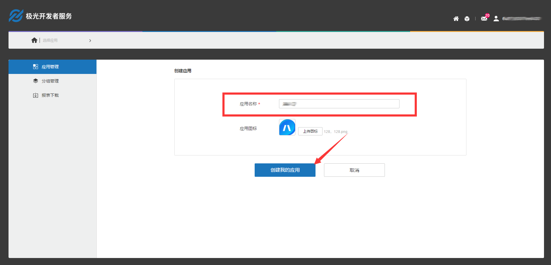 1. 输入APP名称(这里的APP名称和封装时的APP名称可以不一致),APP图标可以不填写,填写完成后,点击【创建我的应用】
